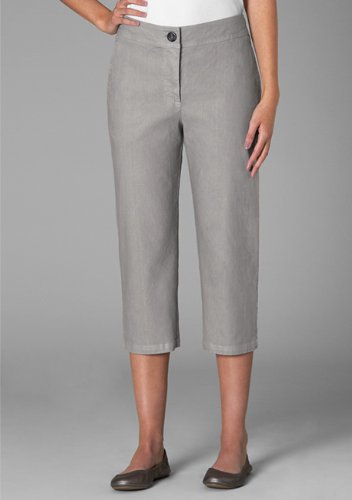 These easy cropped pants are styled with a flat-front waistband, zip fly, and comfortable elastic back. Cropped-length hems show off cute sandals or flats. Women's cropped pants in tarragon, grape mist, stucco. Linen/cotton/spandex. Washable. Made in USA.Sizes: XS(4, S(6-8, M(10-12, L(14-16, XL(18-20; 20 1/2 inseam.