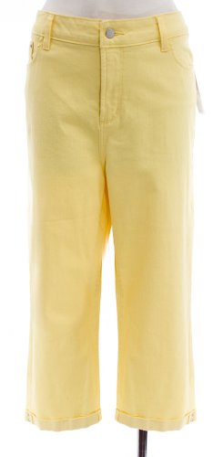 This pant by Not Your Daughter's Jeans in sunflower features cotton stretch fabric, signature "lift tuck technology, revolutionary crisscross front panel, high rise waist, zip and button fly closure, 5 pocket construction and cuffed capri leg with rhinestone detail.